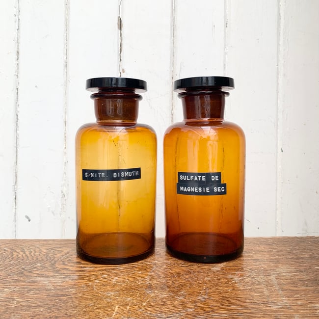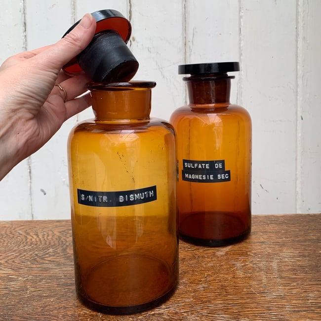 A gorgeous pair of chunky amber glass antique french apothecary bottles, with their glass stoppers a rare find and in excellent vintage condition. DM for more details.