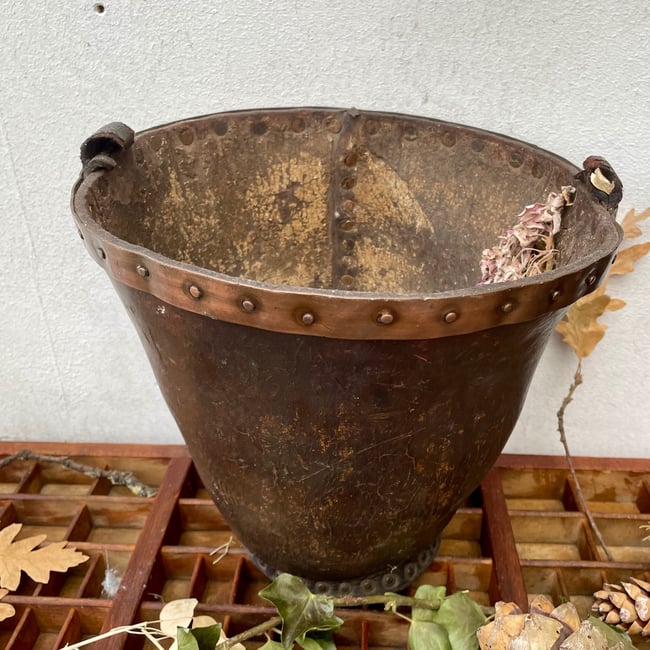 This stunning 18th Century Irish Georgian copper banded and riveted leather fire bucket has beautiful aged patina. Unfortunately the handles are long since gone but the piece remains gorgeous nonetheless. A highly collectible piece that would make a beautiful addition to an antique interior. DM for more details
